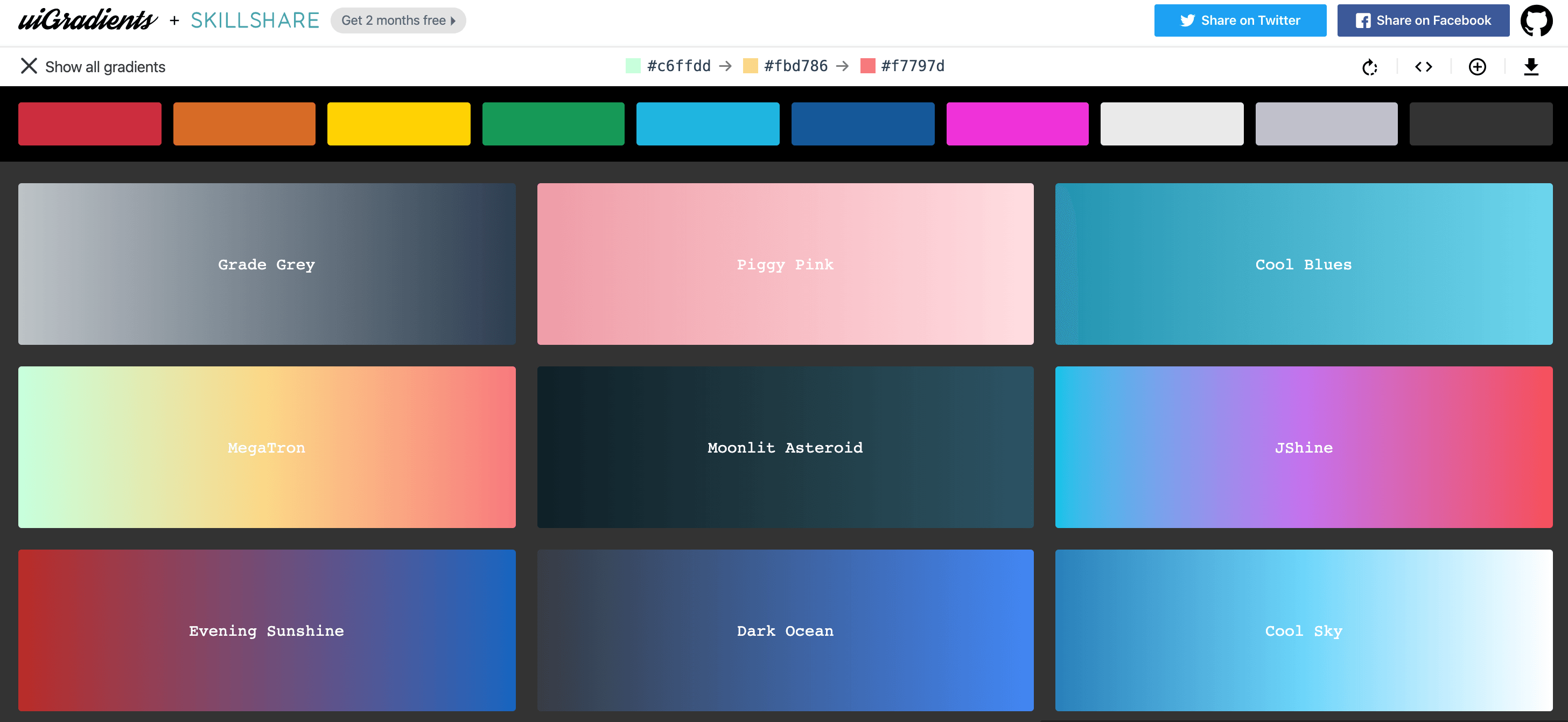 UiGradients是一个免费提供优质渐变色配色的网站,如果你喜欢渐变色背景,可以尝试到这个网站寻宝