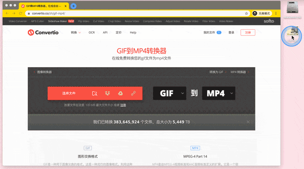 GIF到MP4转换器可以将100MB以内的gif图片转换为MP4,所有转换步骤通过网页在云端完成, gif转换为mp4后, 肉眼看不出清晰度的损失